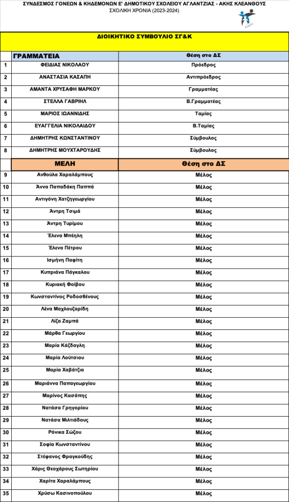 Διοικητικό Συμβούλιο ΣΓ&Κ 2023/24 October 12, 2023October 12, 2023 0 Comment Το νέο Διοικητικό συμβούλιο του ΣΓ&Κ για τη σχολική χρονιά 2023/24 Post navigation Previous Previous post: Next Next post: Leave a Reply Cancel replyYour email address will not be published. Required fields are marked *Comment * Name * Email * Website Save my name, email, and website in this browser for the next time I comment.